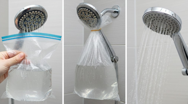 For shower heads that don’t easily detach, you can use a plastic bag filled with vinegar. Secure the bag around the shower head with a rubber band or twist tie, ensuring the nozzles are fully submerged in vinegar. This hands-off approach works beautifully for fixed shower heads.