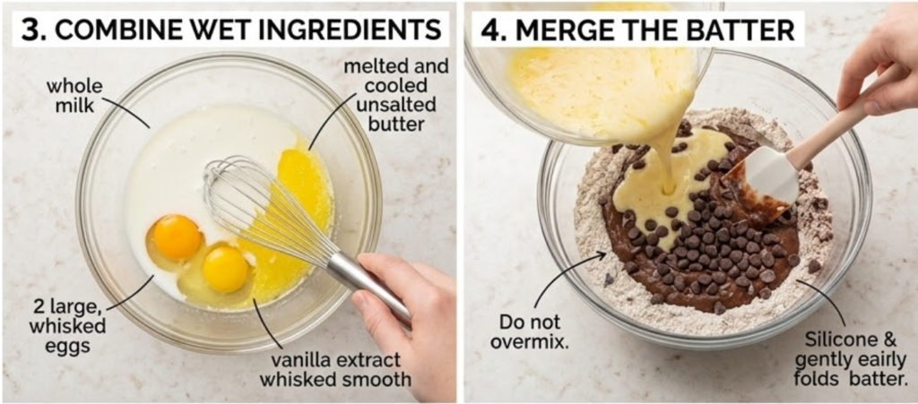 4. Merge the Batter: Pour the wet ingredients into the dry ingredients. Use a spatula to gently fold the mixture together. Be careful not to overmix; a few streaks of flour are fine. Fold in 1 cup of the chocolate chips.
