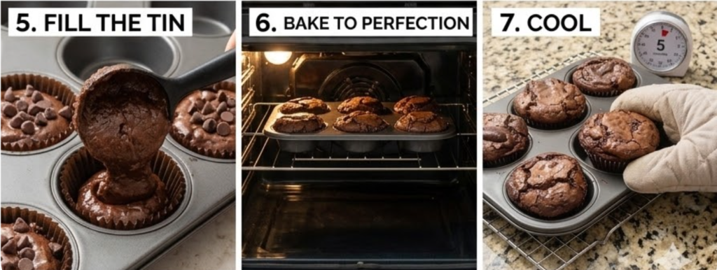 5. Fill the Tin: Divide the batter evenly among the 12 muffin cups, filling them nearly to the top. Sprinkle the remaining 1/2 cup of chocolate chips over the tops for that professional look.