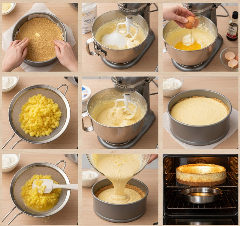Step 1: Preheat your oven to 325°F. In a medium bowl, combine the graham cracker crumbs and melted butter. Press the mixture firmly into the bottom of a 9-inch springform pan to create an even crust. Bake for 8 minutes, then set aside to cool.