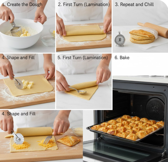 2. First Turn (Lamination): On a lightly floured surface, roll the dough into a long rectangle. Fold the dough into thirds, like a letter. Rotate the dough 90 degrees, wrap, and chill for 30 minutes.